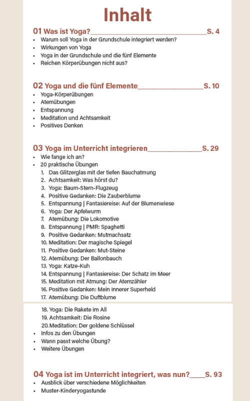Alles in Allem habe ich nie bereut, Yoga in den Unterricht gebracht zu haben. Den Kindern, die davon profitieren, tut es unglaublich gut, und sie genießen es, allen anderen schadet es nicht und selbst, wenn sie nicht mitmachen möchten, können sie zur Ruhe kommen. Ich kannte bereits viele der Übungen, aber war beeindruckt, wie du die Übungen isoliert, mit Beispielen veranschaulicht dargestellt hast. Es lässt sich wirklich jederzeit im Unterricht einsetzen.